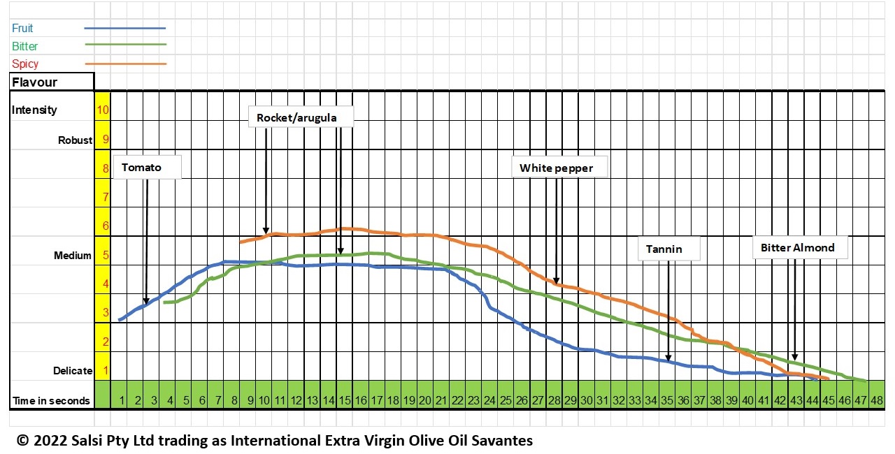 To represent the progression of flavours along the palate, a graph has been devised with the vertical axis representing intensity and the horizontal axis representing time in one second intervals.